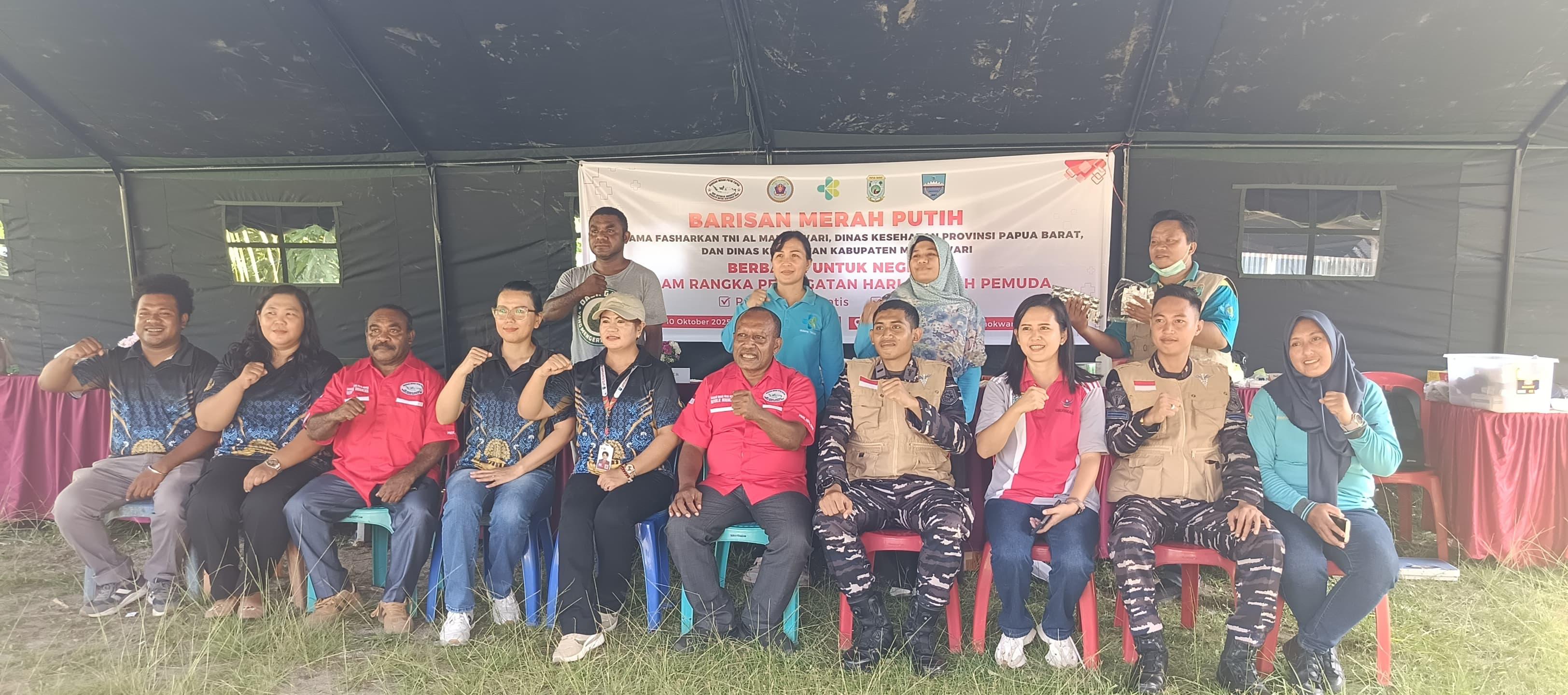 TERASKASUARI.COM, MANOKWARI - Suasana penuh kepedulian tampak di Kampung Petrus Kafiar, Distrik Manokwari Barat, saat Barisan Merah Putih (BMP) Provinsi Papua Barat menggelar kegiatan pengobatan gratis bagi masyarakat. Kegiatan ini terlaksana berkat kerja sama antara BMP Papua Barat dengan Fasharkan TNI AL Manokwari, Dinas Kesehatan Provinsi Papua Barat, dan Dinas Kesehatan Kabupaten Manokwari.